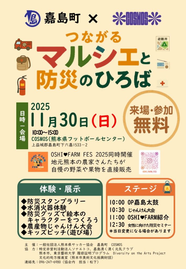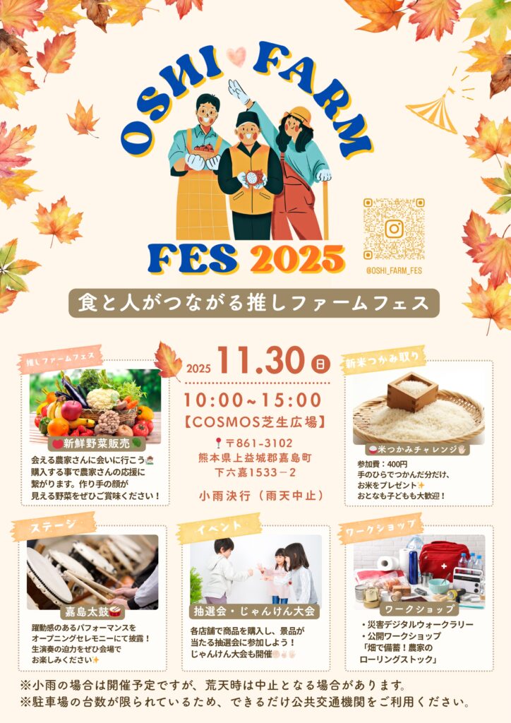 | ステージ | 10:00 OP嘉島太鼓 10:30 じゃんけん大会 11:00 OSHI♥FARM紹介 12:30 女性に向けた防災セミナー ※当日変更になる場合があります |